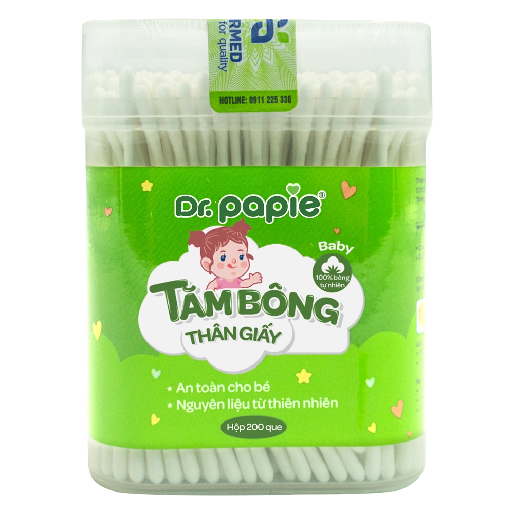 | Tên sản phẩm | Tăm bông thân giấy trẻ em Dr. Papie (200 que, 1 đầu xoắn, 1 đầu dẹt) |