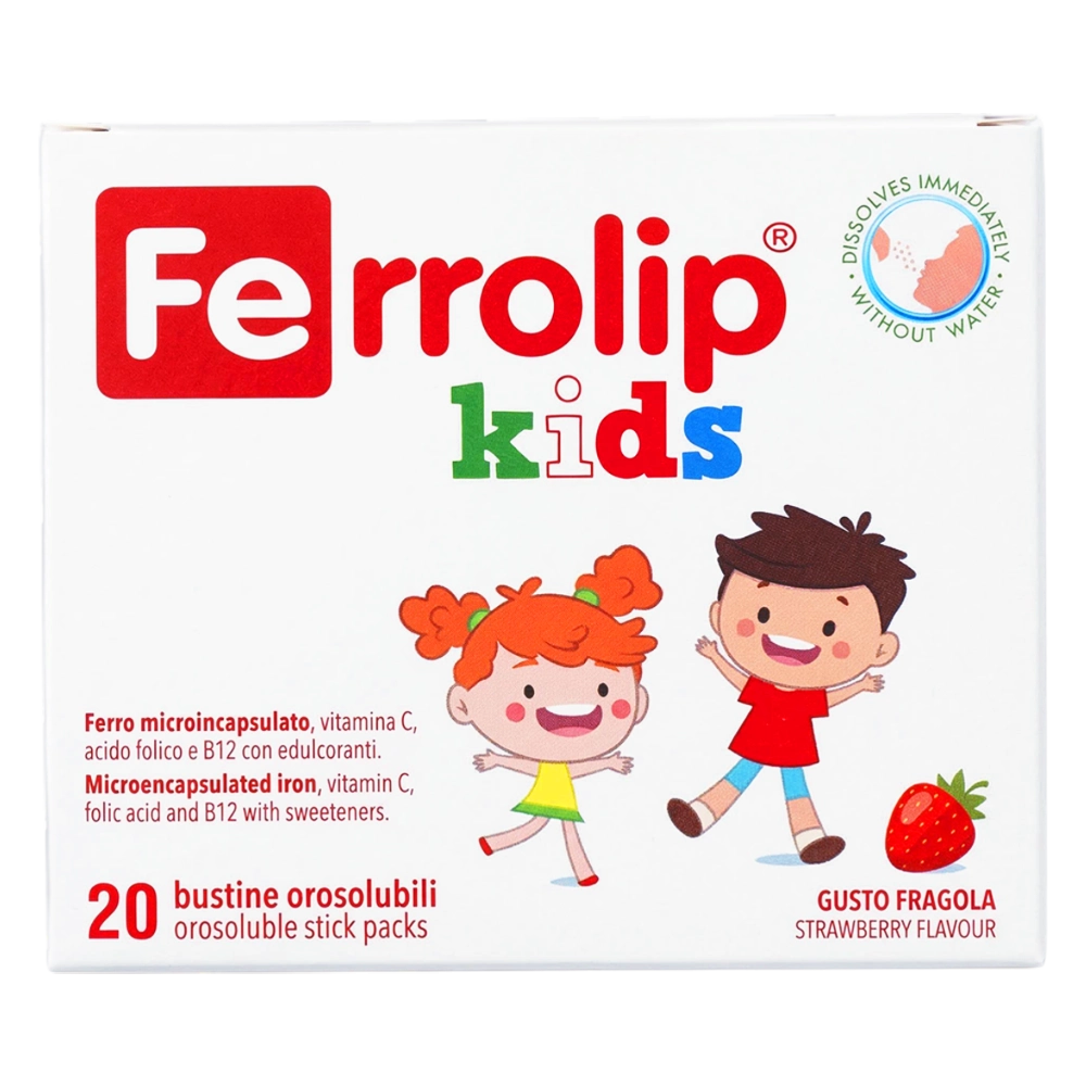 Thực phẩm bảo vệ sức khỏe Ferrolip Kids (hộp 20 gói x 1,5g) là sản phẩm bổ sung sắt dạng bột vi nang hương dâu từ Italy, tan ngay trong miệng không cần nước. Kết hợp bộ 4 thành phần thiết yếu: Sắt pyrophosphate bao vi nang + Vitamin C + Folic Acid + Vitamin B12, hỗ trợ tăng quá trình tạo máu và cải thiện tình trạng thiếu máu do thiếu sắt. Dùng được cho trẻ từ 1 tuổi. Hạn sử dụng: 36 tháng.