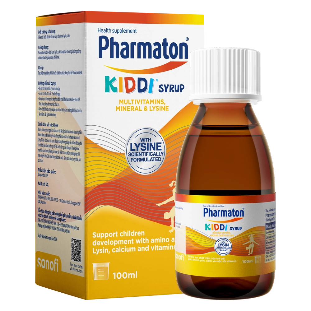 Thực phẩm bảo vệ sức khỏe Pharmaton Kiddi Syrup (lọ 100ml) là siro bổ sung Lysine, canxi và các vitamin thiết yếu giúp tăng cường sức khỏe, hỗ trợ xương chắc khỏe cho trẻ em từ 2 đến 18 tuổi. Hương cam tự nhiên dễ uống. Xuất xứ Úc.