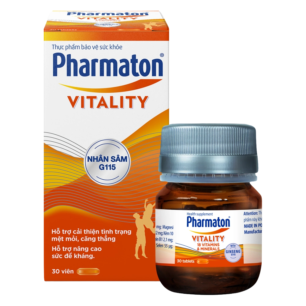 Thực phẩm bảo vệ sức khỏe Pharmaton Vitality (30 viên) là sản phẩm đa vitamin và khoáng chất tích hợp chiết xuất nhân sâm chuẩn hóa G115, hỗ trợ cải thiện tình trạng mệt mỏi, căng thẳng và nâng cao sức đề kháng. Được chứng minh qua 20 nghiên cứu lâm sàng. Sản xuất tại Ba Lan.