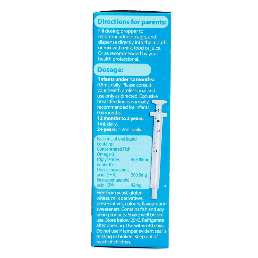 Mỗi ml chứa: 463,88 mg Omega-3 triglyceride. Trong đó: DHA (Axit docosahexaenoic): 200,5 mg+ EPA (Axit Eicosapentaenoic): 42 mg.